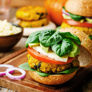sauce aïoli maison, steak de haricot rouge maison, avocat, salade et carotte râpé servi avec frites